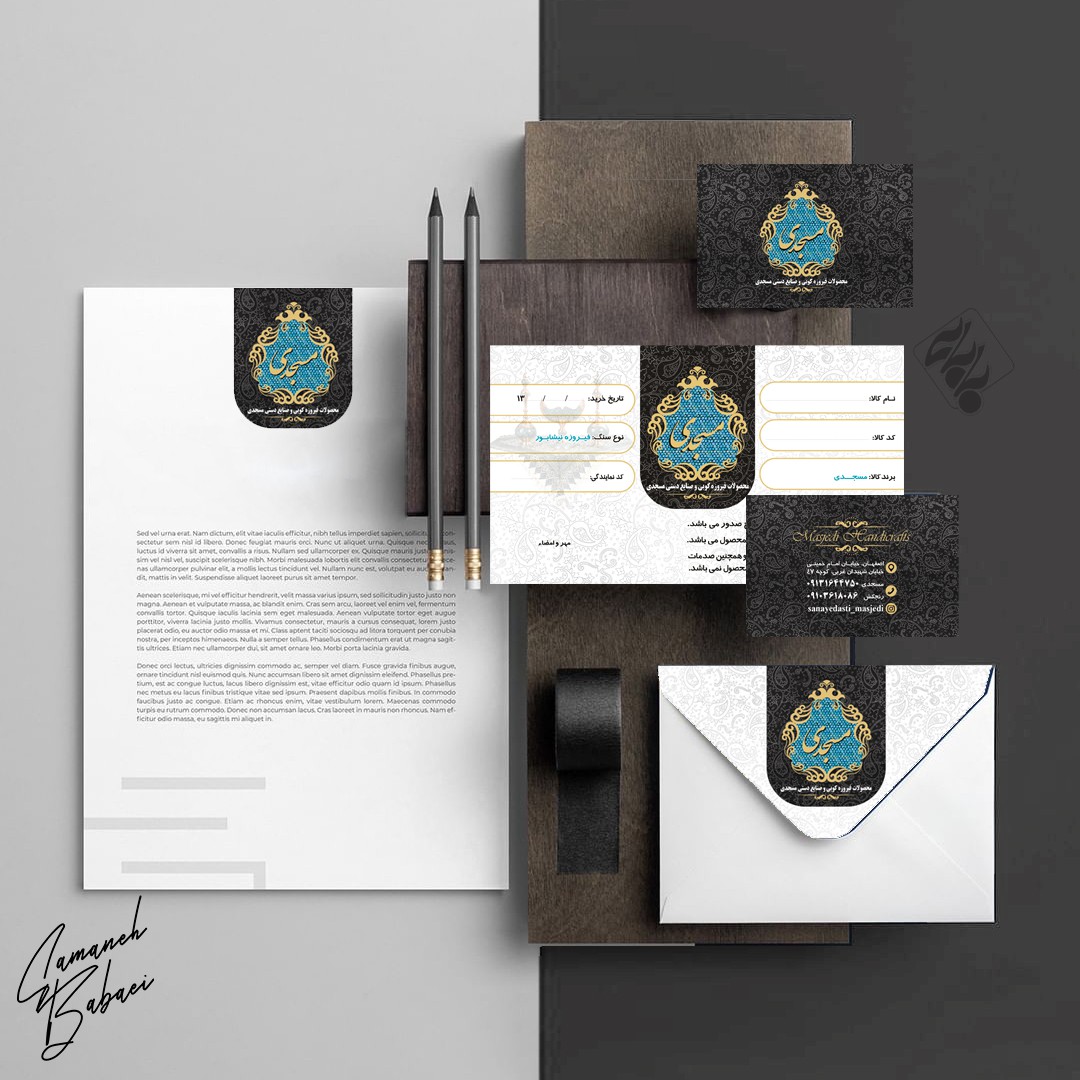 طراحی ست اداری(کارت ویزیت، پاکت نامه، سربرگ، ضمانت نامه) صنایع دستی مسجدی